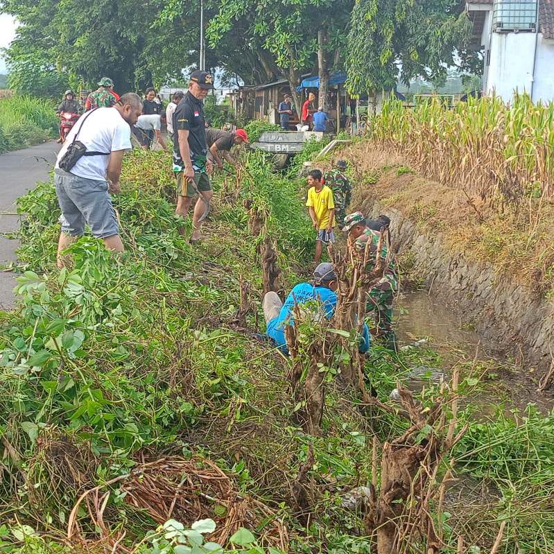 Dengan alat sederhana, Anggota Koramil 0808/04 Sanankulon bersama warga bahu-membahu membersihkan sampah dan rumput liar yang menghambat aliran air ke area persawahan.