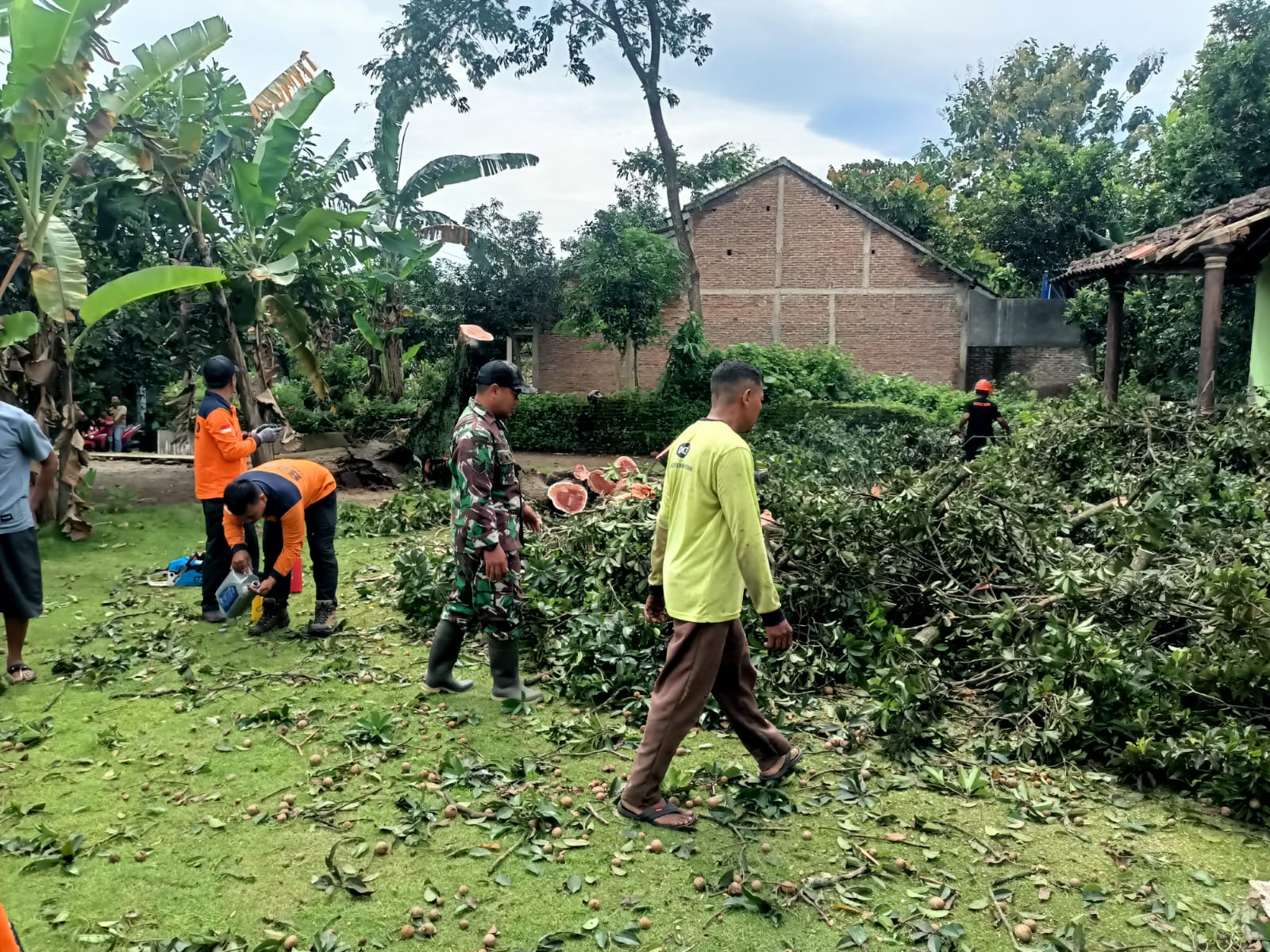 Pohon sawo milik Ibu Sunarti (52) roboh setelah diterjang angin kuat dan mengakibatkan kerusakan cukup parah pada bagian atap rumah. Sejumlah warga sekitar, di antaranya Bapak Darmadi (70) dan Bapak Fahrudin (55), menjadi saksi kejadian dan segera memberikan pertolongan awal sebelum petugas tiba di lokasi.