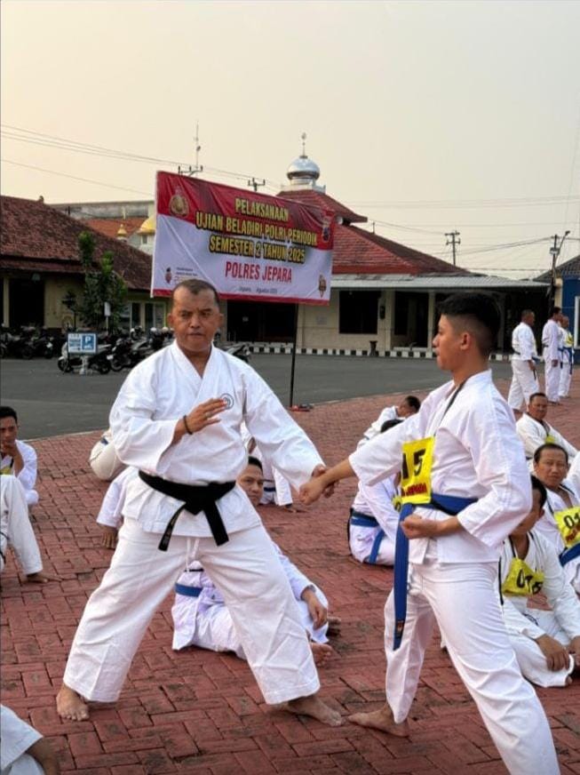 jurnalis.or.id – Polres Jepara | Kepolisian Resor (Polres) Jepara, Polda Jawa Tengah, menggelar ujian beladiri Polri Periodik Semester 2 Tahun 2025 bertempat di halaman Mapolres setempat, pada Selasa (5/8/2025).Ujian beladiri Polri termasuk dalam 13 aspek komponen penilaian kinerja Personel Polri yang dikelola oleh Sumber Daya Manusia (SDM) Polri.