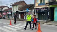 Ps. Panit Lantas Polsek Cikijing Laksanakan Gatur Pagi, Pastikan Keselamatan Anak Sekolah Saat Menyeberang Jalan