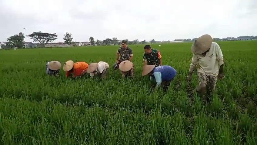 Di tengah terik matahari, terlihat beberapa Babinsa dengan cekatan mencabuti gulma yang tumbuh di antara tanaman padi. Mereka bahu-membahu bersama petani membersihkan rumput liar yang dapat mengganggu pertumbuhan padi.