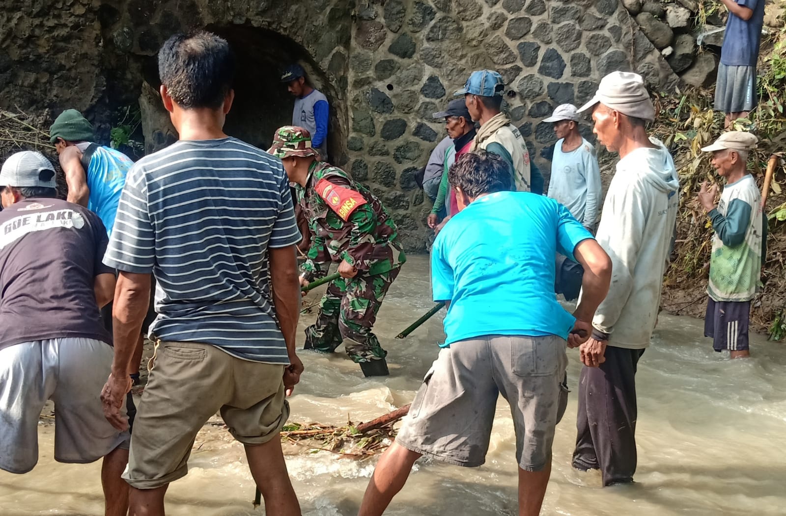 Cegah Banjir Babinsa dan Warga Gotong Royong Bersihkan Jembatan Tersumbat Sampah.