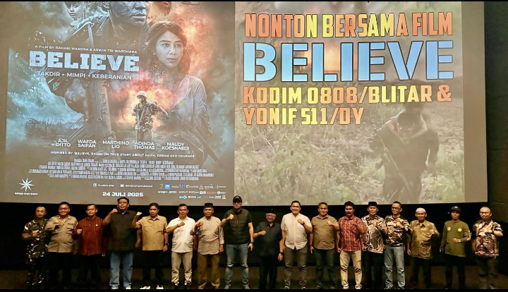 Blitar – Bertempat di CVG Cinemas Blitar Town Square (BLITOS) Jl. Merdeka Kelurahan Kepanjenlor Kecamatan Kepanjenkidul Kota Blitar, Jumat petang (8/8/2025), digelar kegiatan nonton bareng (nobar) film berjudul Believe yang diinisiasi Kodim 0808/Blitar. Kegiatan ini dihadiri Bupati Blitar Drs. H. Rijanto, M.M, Dandim 0808/Blitar Letkol Inf Hendra Sukmana, M.Han, Kapolres Blitar AKBP Arif Fazlurrahman, S.H., S.I.K., M.Si, Kapolres Blitar Kota AKBP Titus Yudho Uly, S.I.K., M.Si, jajaran OPD Pemkab Blitar, Ketua Hipakad Bpk. Sugeng, Ketua FKPPI Bpk. Joko Trisno serta anggota Paskibraka Kecamatan Wlingi. Sekitar 80 orang hadir dalam suasana penuh kekeluargaan dan semangat nasionalisme.