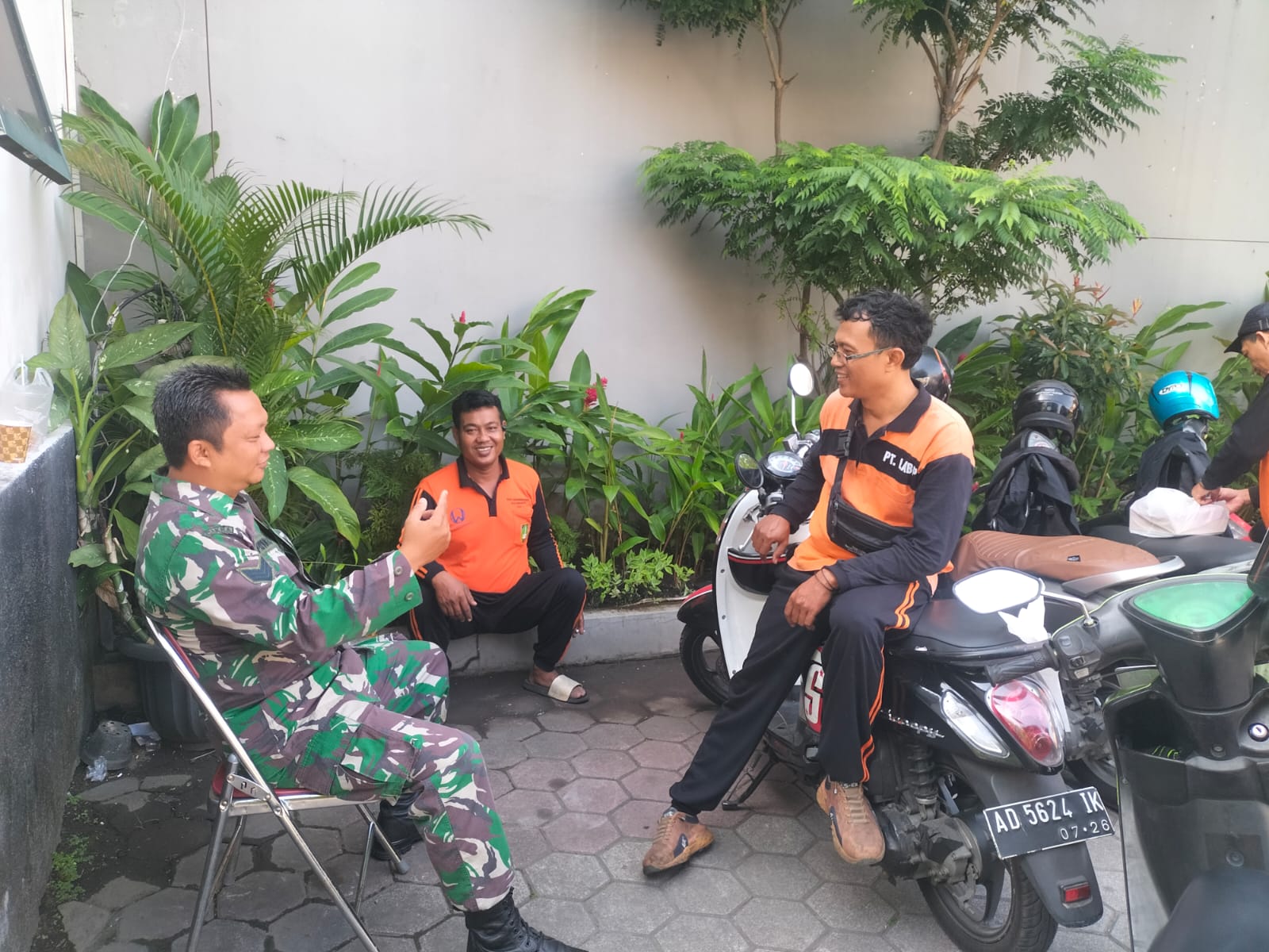 jurnalis.or.id, Surakarta – Babinsa Kelurahan Kemlayan Koramil 03/Serengan Kodim 0735/Surakarta Serka Priyanto Komsos dengan duduk bersama dan ngobrol santai dengan petugas kebersihan Kelurahan bertempat di Halaman Kelurahan Kemlayan Kecamatan Serengan Kota Surakarta.