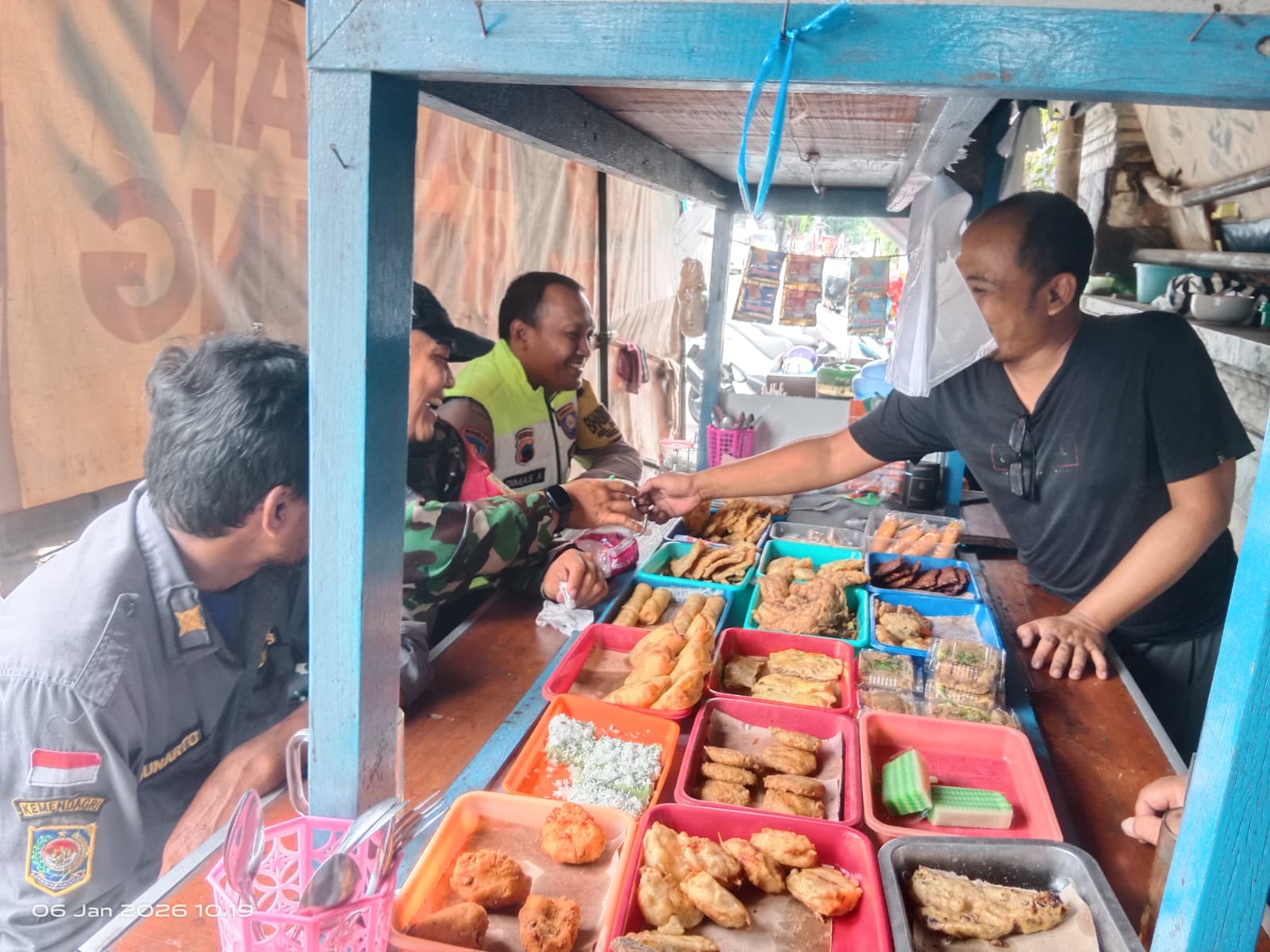 jurnalis.or.id, Surakarta, Babinsa Danukusuman Koramil 03/Serengan Kodim 0735/Surakarta Serda Tito sedang berinteraksi dengan Bhabinkamtibmas dan Warga di wedangan Pak Kuncung Jl Pattimura Danukusuman Serengan Kota Surakarta, Selasa (13/01/2026)