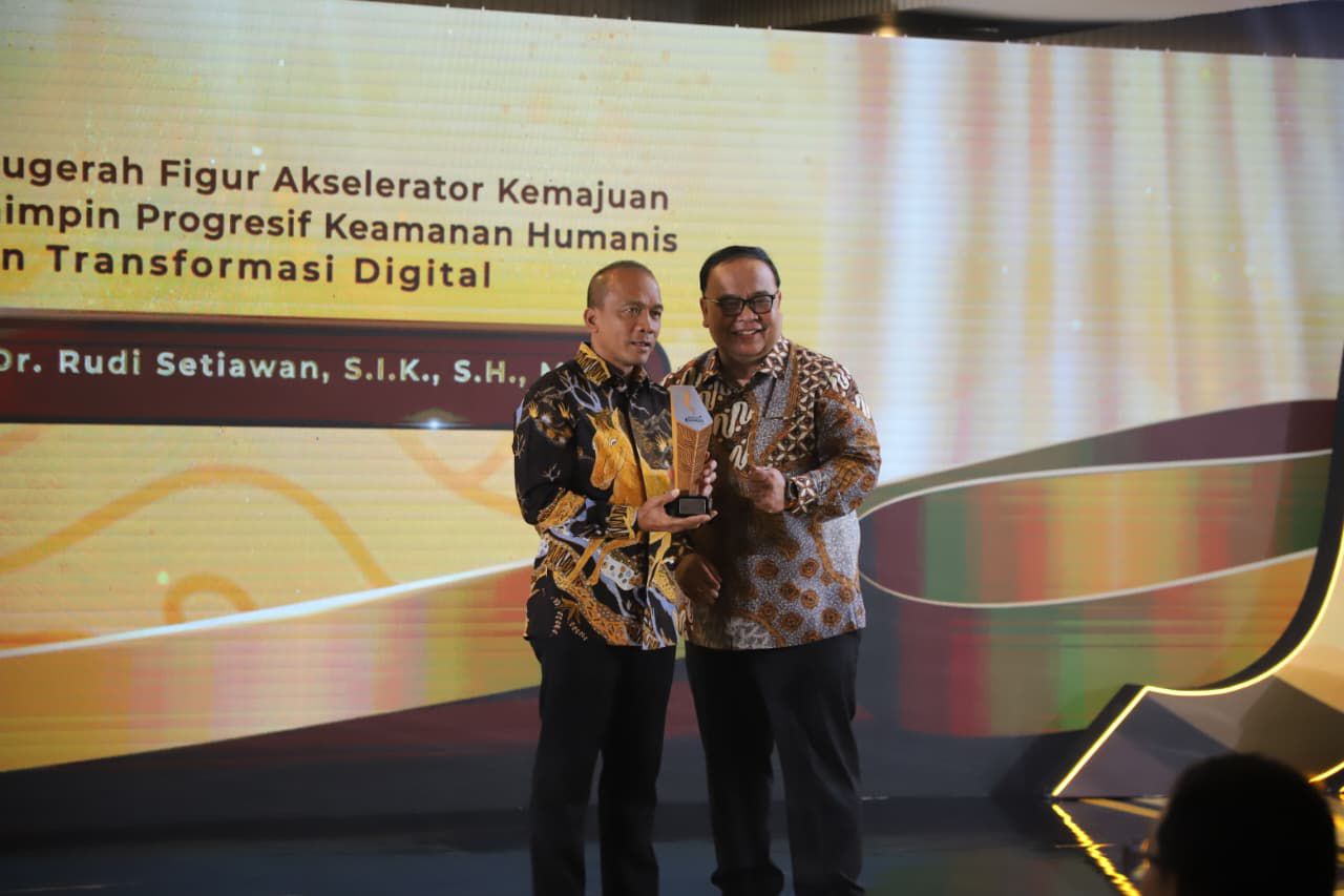 Kapolda Jabar Irjen Pol. Rudi Setiawan menerima trofi tokoh Transformasi keamanan digital dan Inklusivitas Polri yang diserahkan langsung oleh Direktur Transmedia Latif Harnoko.