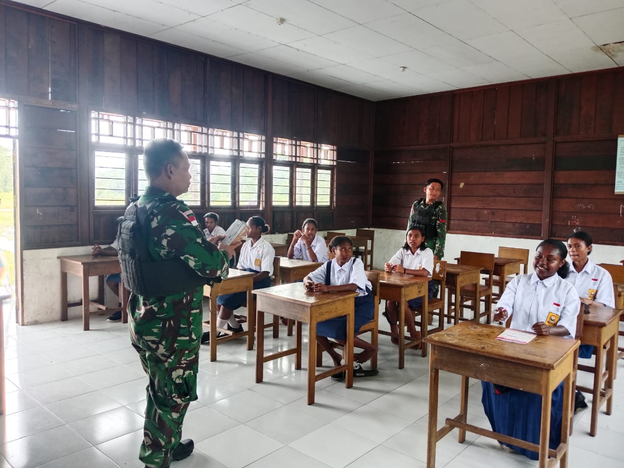 Sertu sukiswandi (Wadanpos) dan personel Pos Aroba turut mendampingi proses belajar mengajar di kelas, memberikan materi pelajaran, serta memotivasi siswa agar lebih aktif, disiplin, dan semangat dalam menuntut ilmu.