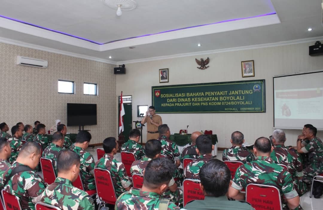 jurnalis.or.id – Dalam upaya meningkatkan kesadaran akan pentingnya kesehatan serta pencegahan penyakit tidak menular, khususnya penyakit jantung, Kodim 0724/Boyolali bekerja sama dengan Dinas Kesehatan Kabupaten Boyolali menggelar sosialisasi dan penyuluhan kesehatan tentang bahaya penyakit jantung. Kegiatan ini berlangsung di Aula Makodim 0724/Boyolali, Jalan Padanaran, Desa Tegalmulyo, Kecamatan Mojosongo, Kabupaten Boyolali, Senin (22/12/2025).