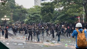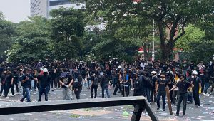 Massa justru melanjutkan aksi anarkis dengan merusak pagar pembatas jalan, melakukan vandalisme di aspal Jalan Pahlawan, dan terus melempari petugas dengan botol, batu, serta benda-benda berbahaya lainnya.