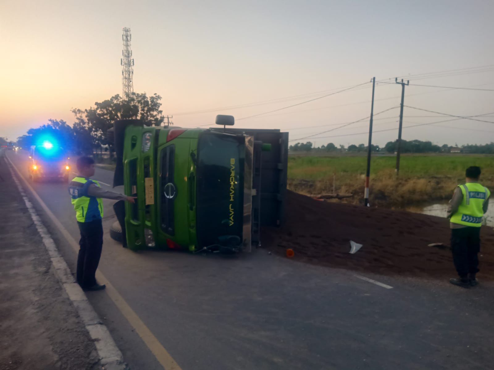 “Beruntung, dalam kejadian ini tidak ada korban jiwa. Namun, truk mengalami kerusakan dan muatan pasir tumpah ke badan jalan, mengganggu lalu lintas di lokasi kejadian,” ujarnya.