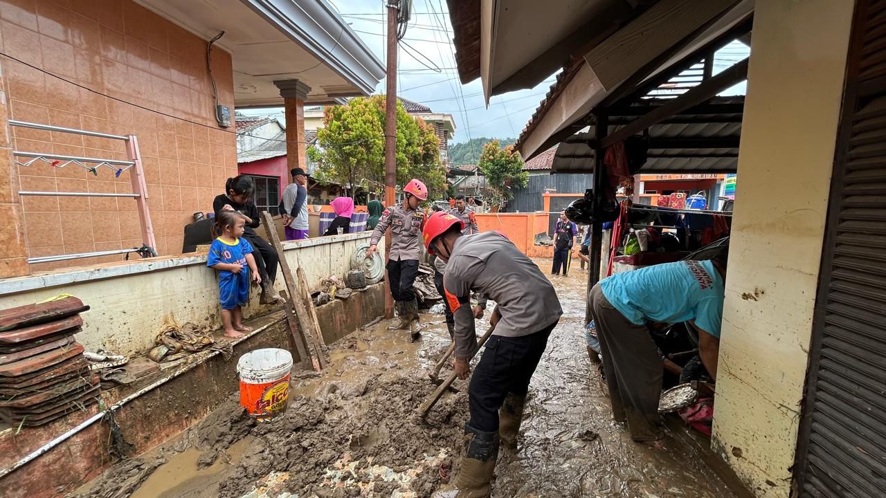 Kabid Humas Polda Jabar Kombes Pol. Hendra Rochmawan, S.I.K., M.H. menjelaskan bahwa Tim SAR Batalyon B Pelopor bersama unsur TNI, BPBD, relawan, dan masyarakat setempat melanjutkan kegiatan pembersihan puing-puing dan lumpur di area permukiman warga yang terendam banjir.