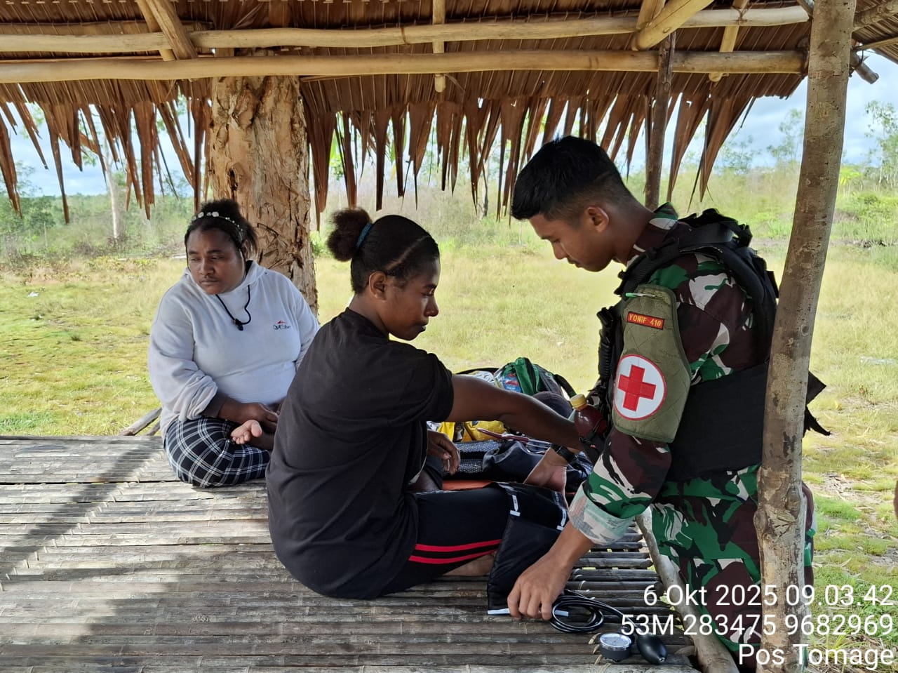 jurnalis.or.id – Satgas Pamtas RI-PNG Kewilayahan Yonif 410/ALG Pos Tomage yang dipimpin oleh Serda Giffari bersama enam orang anggota melaksanakan kegiatan yankes di Kampung Wanmar, Distrik Tomage, Kabupaten Fak Fak, Provinsi Papua Barat. Pada hari Senin (06/10/2025).