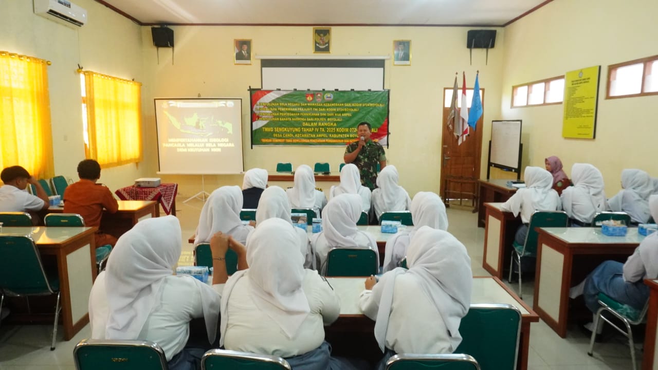 jurnalis.or.id – Sadar akan pentingnya menumbuhkan jiwa nasionalisme sejak dini, Satgas TNI Manunggal Membangun Desa (TMMD) Sengkuyung Tahap IV Tahun 2025 Kodim 0724/Boyolali memberikan sosialisasi bela negara dan wawasan kebangsaan kepada siswa-siswi SMA Negeri 1 Ampel, Kecamatan Ampel, Kabupaten Boyolali, Senin (13/10/25).