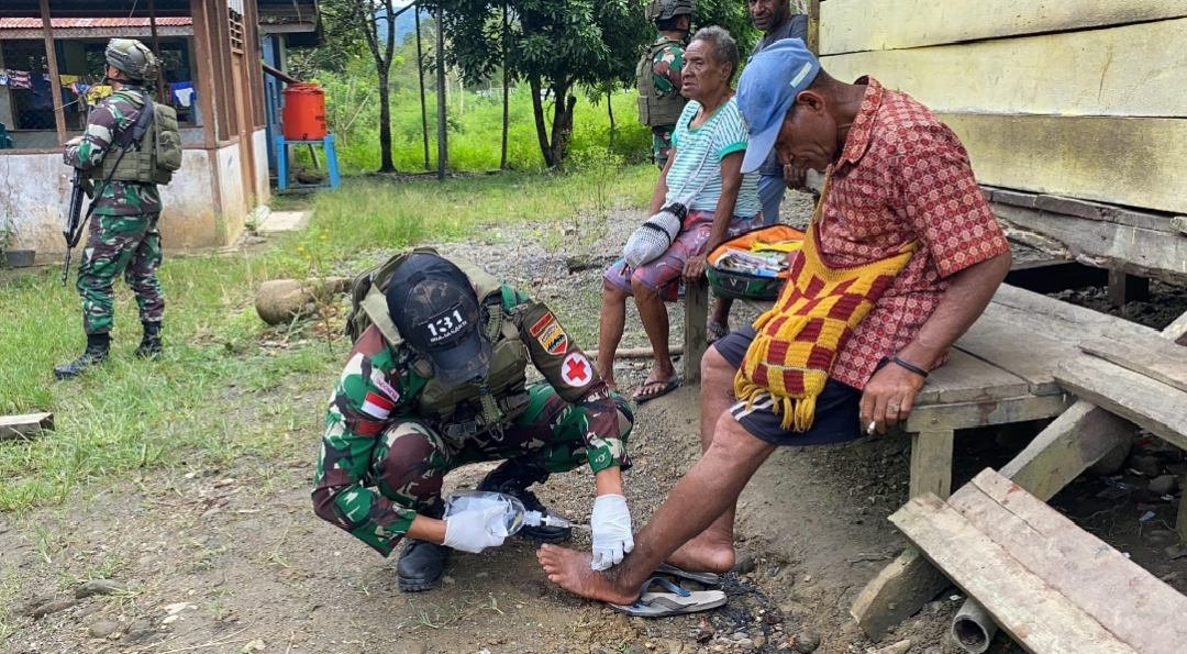 jurnalis.or.id — Suasana hangat penuh keakraban tampak di Kampung Kalibom, Kabupaten Keerom, saat Satgas Yonif 131/Brajasakti menggelar pelayanan kesehatan gratis bagi warga. Kegiatan kemanusiaan ini dipimpin langsung oleh Serka Widi dan dilaksanakan dari rumah ke rumah, menyasar masyarakat yang membutuhkan pelayanan medis.