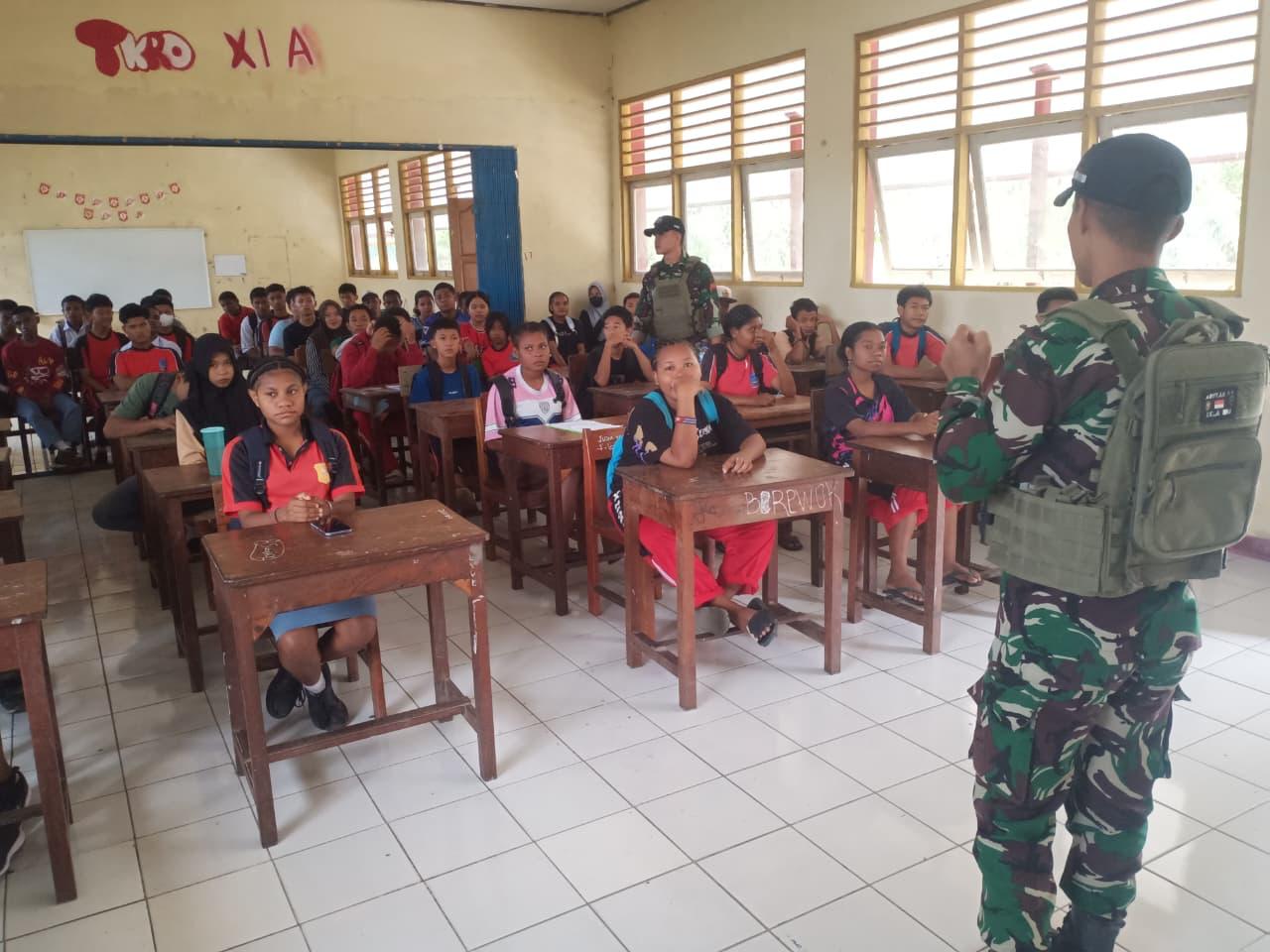 Dipimpin oleh Sertu Hidayatullah, personel Satgas hadir di SMK 7 Jayapura untuk memberikan pelajaran wawasan kebangsaan kepada para siswa.