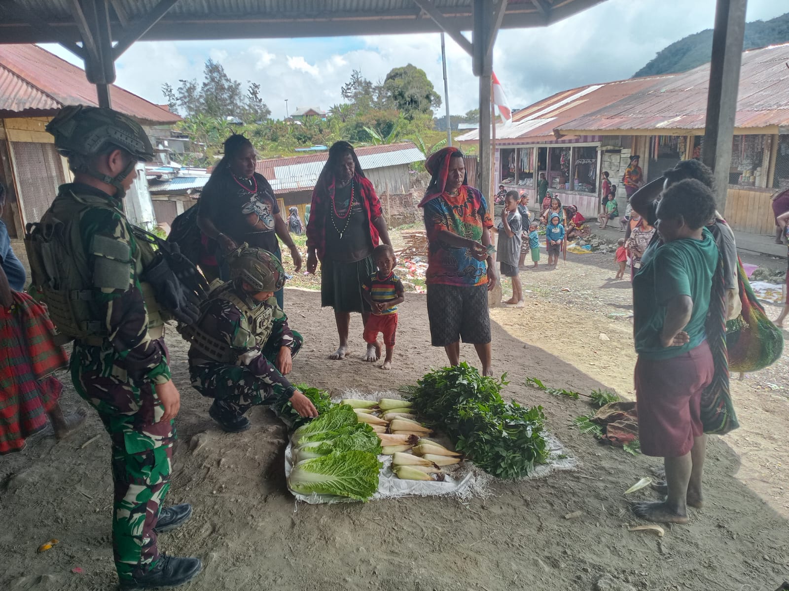 Dengan penuh semangat, prajurit TNI memborong berbagai hasil tani warga mulai dari sayuran segar, ubi, hingga buah-buahan lokal. Langkah sederhana namun bermakna ini menjadi bentuk nyata kepedulian TNI dalam mendukung perekonomian masyarakat di pedalaman Papua.