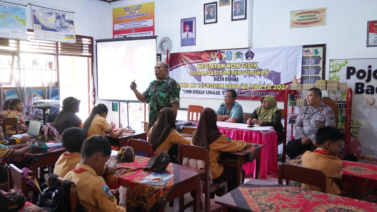 jurnalis.or.id, Blitar – Personel Satgas TNI Manunggal Membangun Desa (TMMD) ke-127 Kodim 0808/Blitar terus menggencarkan sasaran non-fisik dengan memberikan pembekalan Wawasan Kebangsaan (Wasbang) kepada generasi muda. Kali ini, Kapten Inf Slamet memberikan materi langsung kepada siswa-siswi SDN Krisik 04 di Desa Krisik Kecamatan Gandusari Kabupaten Blitar, Jumat (6/3/2026).