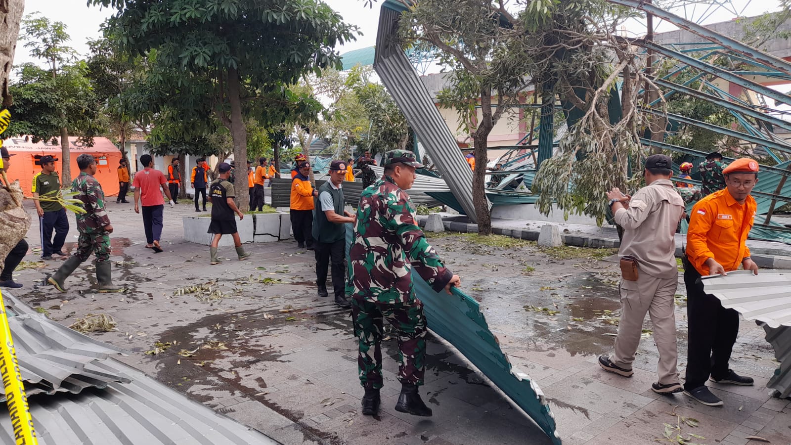 Kegiatan kerja bakti berlangsung dengan penuh semangat dan gotong royong. Para peserta bahu-membahu membersihkan puing-puing atap stadion yang runtuh akibat terjangan angin kencang. Selain membersihkan area, petugas juga melakukan pengecekan struktur bangunan untuk memastikan tidak ada bagian lain yang berpotensi membahayakan warga.