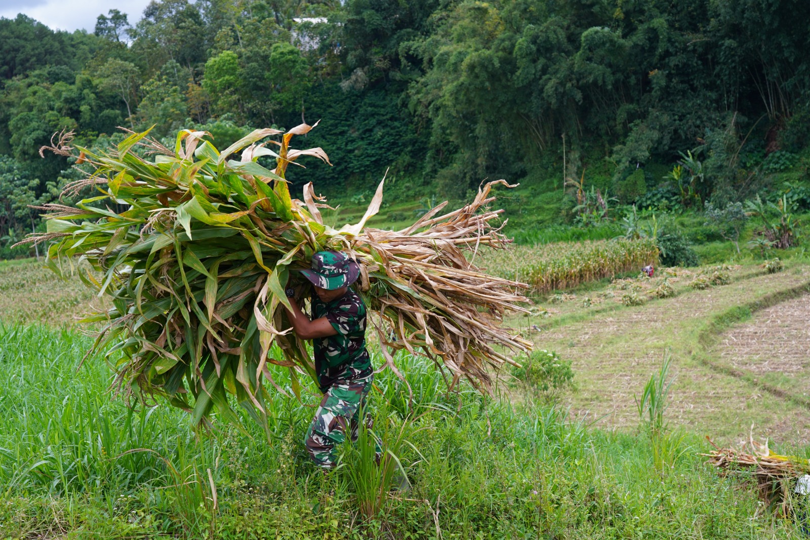 Pemandangan ini menjadi bukti bahwa semangat pengabdian TNI tidak terbatas pada proyek konstruksi semata. Di sela waktu istirahat pengerjaan jalan, para prajurit yang melihat warga kesulitan membawa beban rumput yang berat langsung turun tangan membantu memanggul pakan tersebut melewati medan yang cukup terjal.
